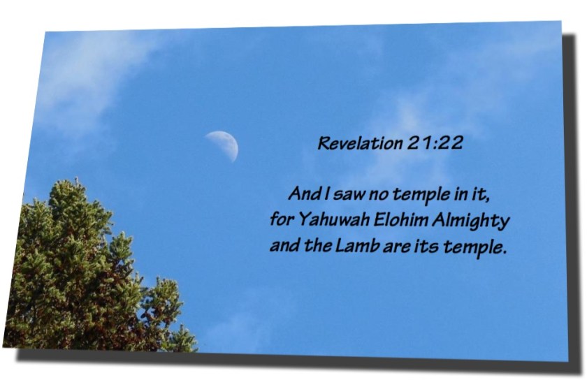 11 having Yahuwah’s glory [filled with His radiant light].22 I saw no temple in it, for the Yahuwah Elohim Almighty [the Omnipotent, the Ruler of all] and the Lamb are its temple.