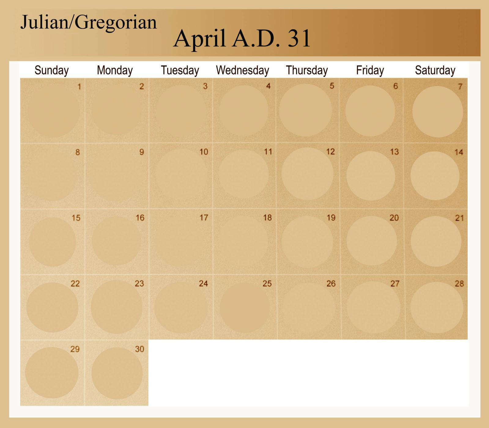 The luni-solar calendar and the gregorian calendar for AD31 side by side.