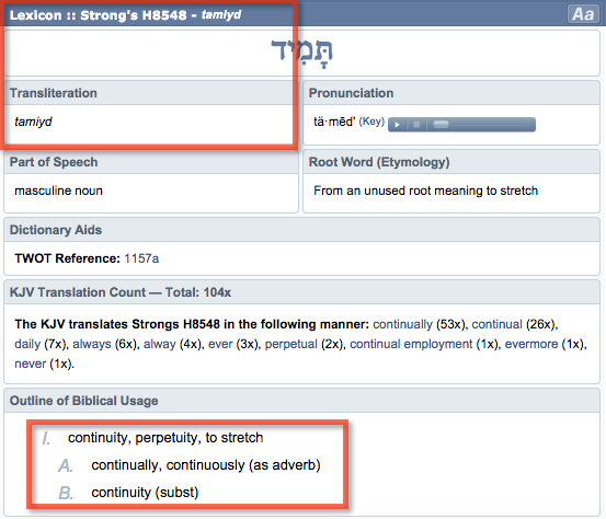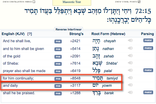 Above, the words “tamiyd” and “yowm” have been translated correctly as