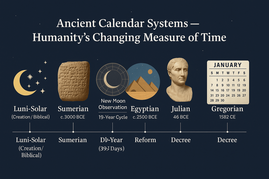 This article will explore how various ancient civilizations measured time—Sumerian, Babylonian, Egyptian, and Roman—and then return to the Biblical Calendar to see how it stands apart. Along the way, we will compare lunar, solar, and luni-solar calendars and show how Scripture’s pattern uses all three heavenly lights in harmony.